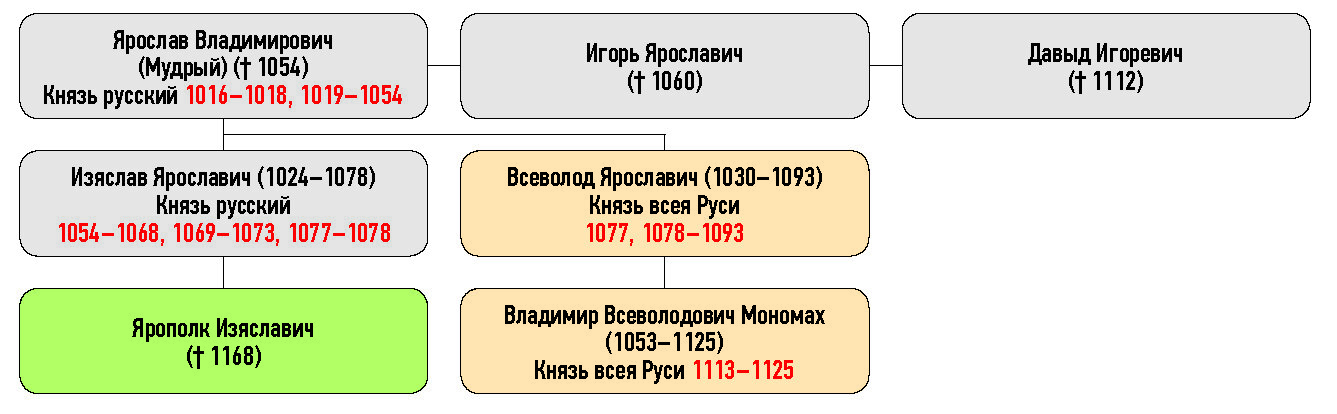 Ярослав Владимирович (Мудрый) († 1054), Изяслав Ярославич (1024–1078) Князь русский, Игорь Ярославич († 1060), Давыд Игоревич († 1112), Всеволод Ярославич (1030–1093) Князь всея Руси, Ярополк Изяславич († 1168), Владимир Всеволодович Мономах (1053–1125)