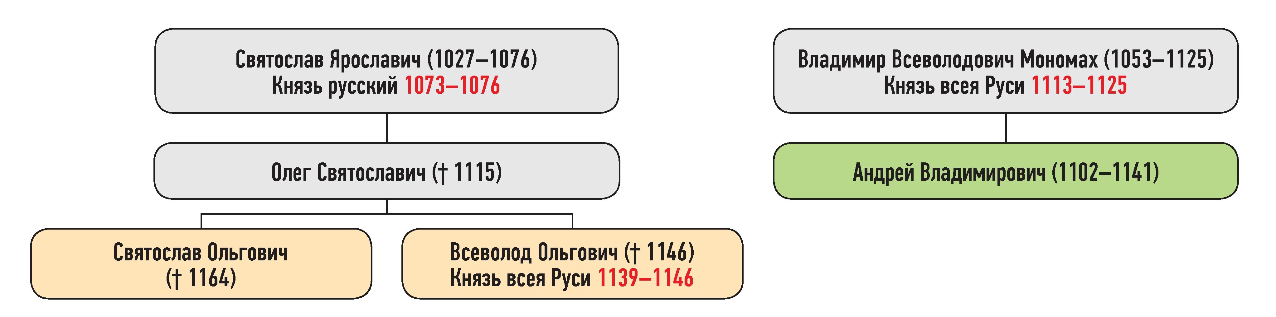 Всеволод, Святослав Ольговичи — сыновья Олега Святославича, Андрей Владимирович — сын Владимира Всеволодовича Мономаха