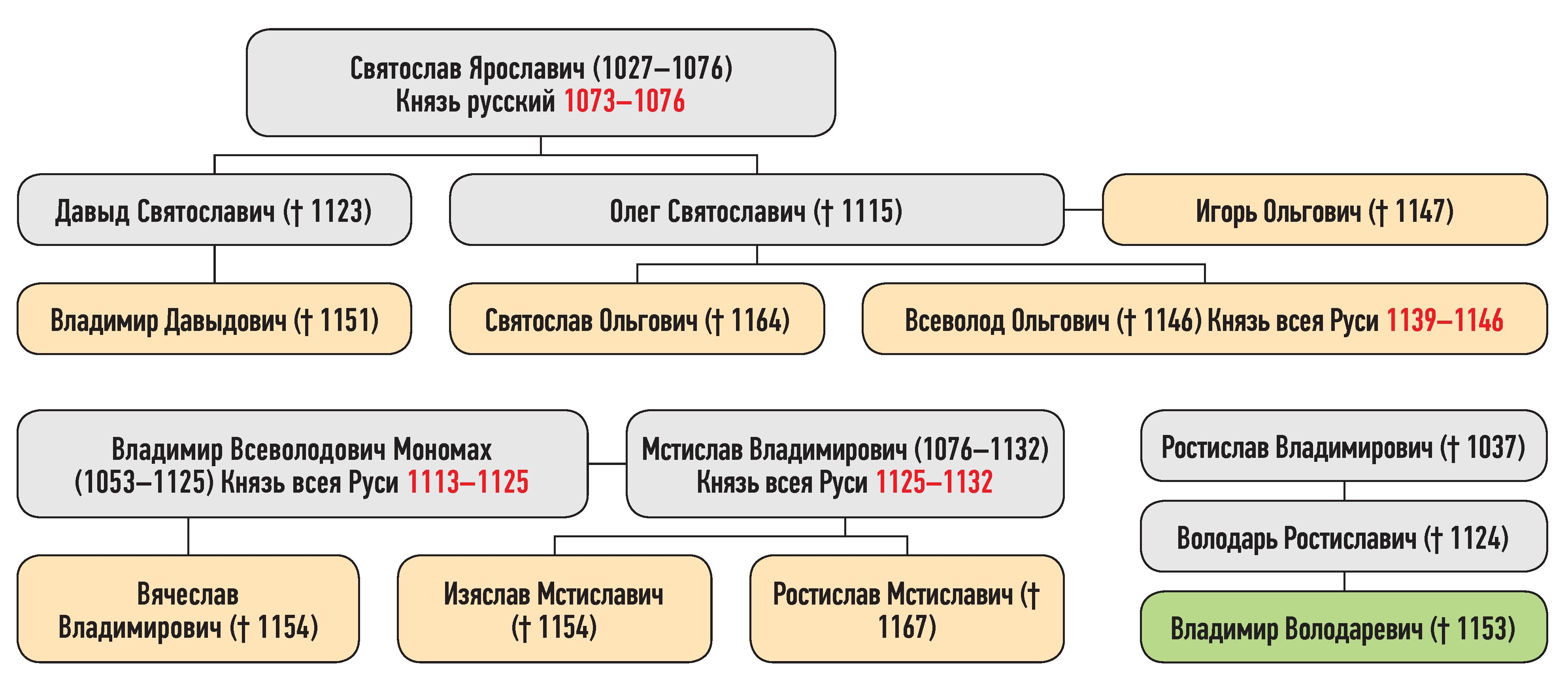 Всеволод, Святослав, Игорь Ольговичи — сыновья Олега Святославича, Изяслав, Ростислав Мстиславичи — сыновья Мстислава Владимировича, Владимир Давыдович — сын Давыда Святославича, Вячеслав Владимирович — сын Владимира Всеволодовича Мономаха, Владимир Володаревич — сын Володаря Ростиславича