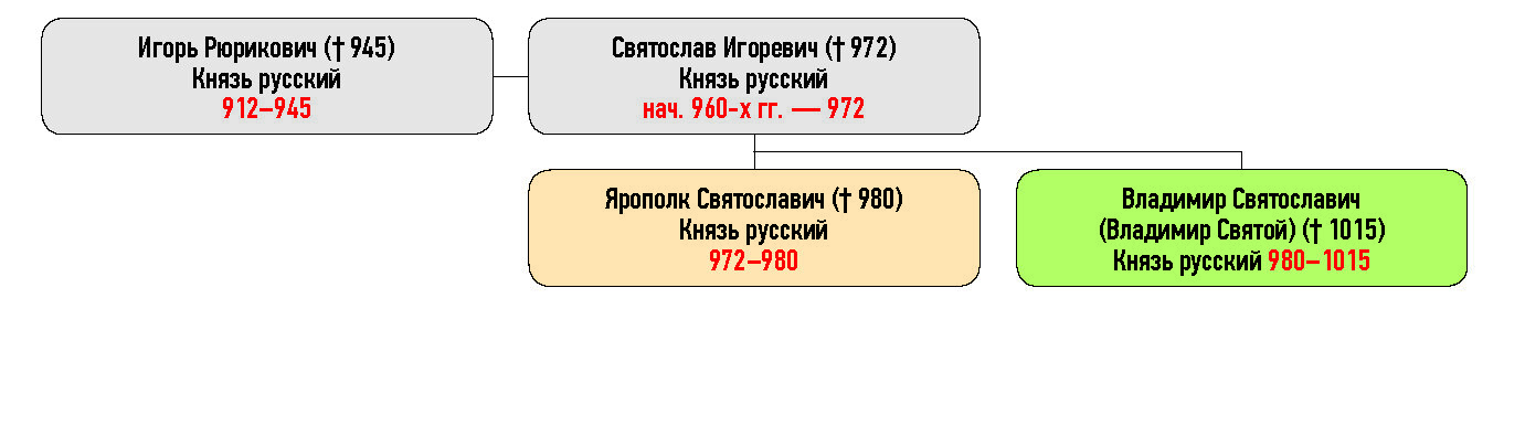 Игорь Рюрикович († 945) Князь русский, Святослав Игоревич († 972) Князь русский, Ярополк Святославич († 980) Князь русский, Владимир Святославич (Владимир Святой) († 1015)