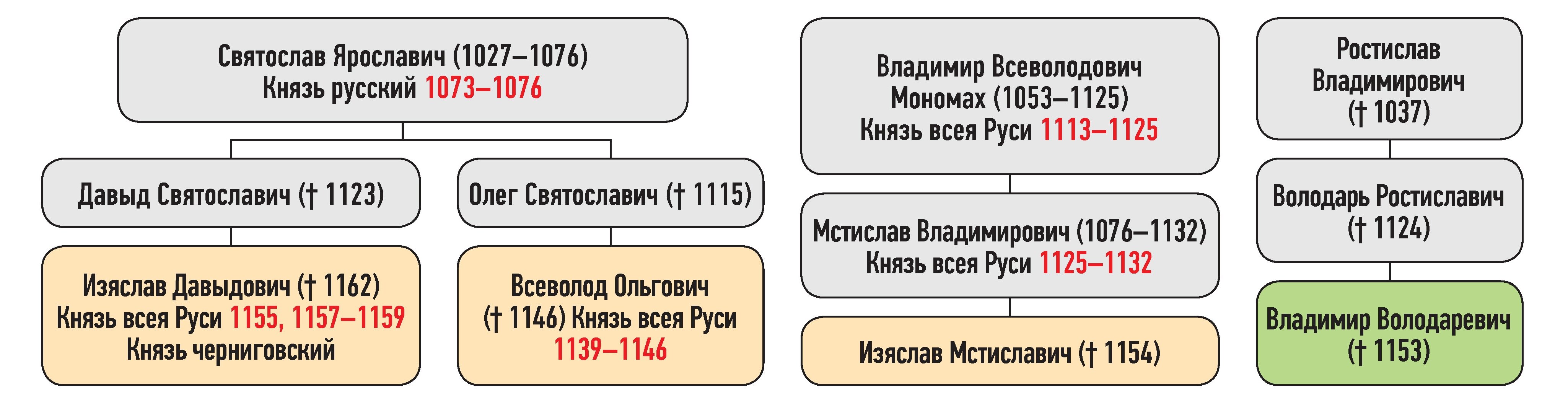 Всеволод Ольгович — сын Олега Святославича, Изяслав Мстиславич — сын Мстислава Владимировича, Изяслав Давыдович — сын Давыда Святославича, Владимир Володаревич — сын Володаря Ростиславича
