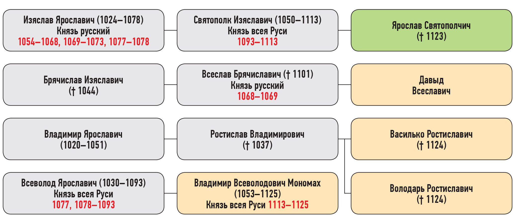 Владимир Мономах — сын Всеволода Ярославича, Давыд Всеславич — сын Всеслава Брячиславича, Володарь, Василько Ростиславичи — дети Ростислава Владимировича, внука Ярослава, Ярослав Святополчич — сын Святополка Изяславича, Изяслав Ярославич (1024–1078) Князь русский, Брячислав Изяславич († 1044), Владимир Всеволодович Мономах (1053–1125) Князь всея Руси, Святополк Изяславич (1050–1113) Князь всея Руси, Всеслав Брячиславич († 1101) Князь русский, Глеб Всеславич († 1119), Давыд Всеславич