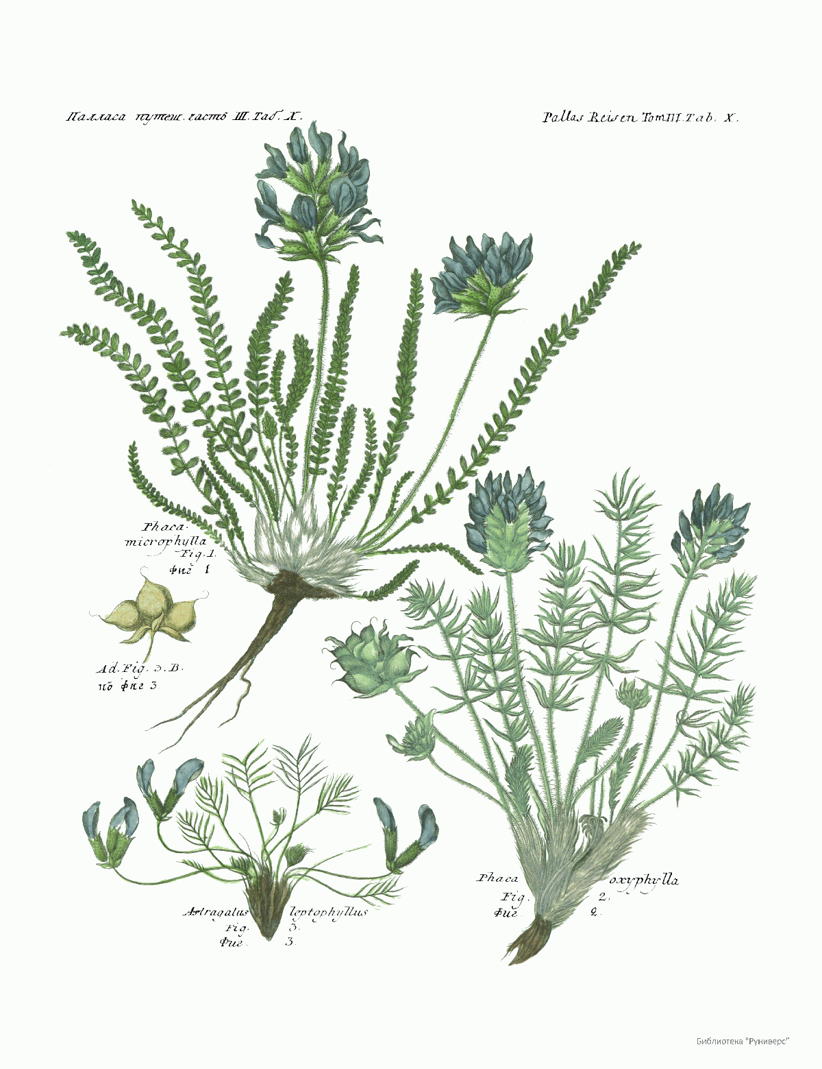 Том III. Таб.X. Phaca microphylla. Phaca oxyphylla. Astragalus leptophyllus.