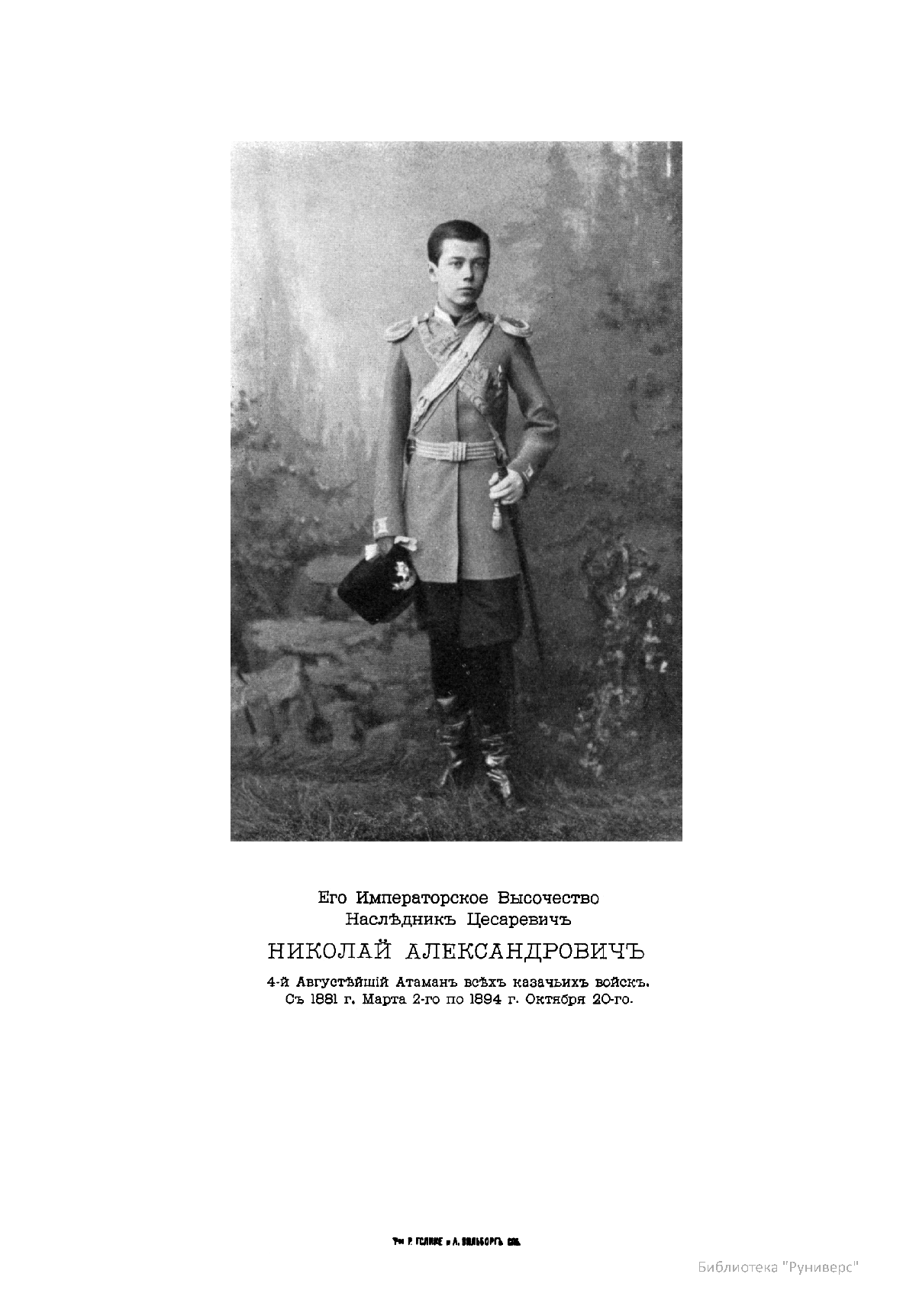 Его Императорское Высочество Наследник Цесаревич Николай Александрович. 4-й Августейший Атаман всех казачьих войск. С 1881 г. Марта 2-го по 1894 г. Октября 20-го.