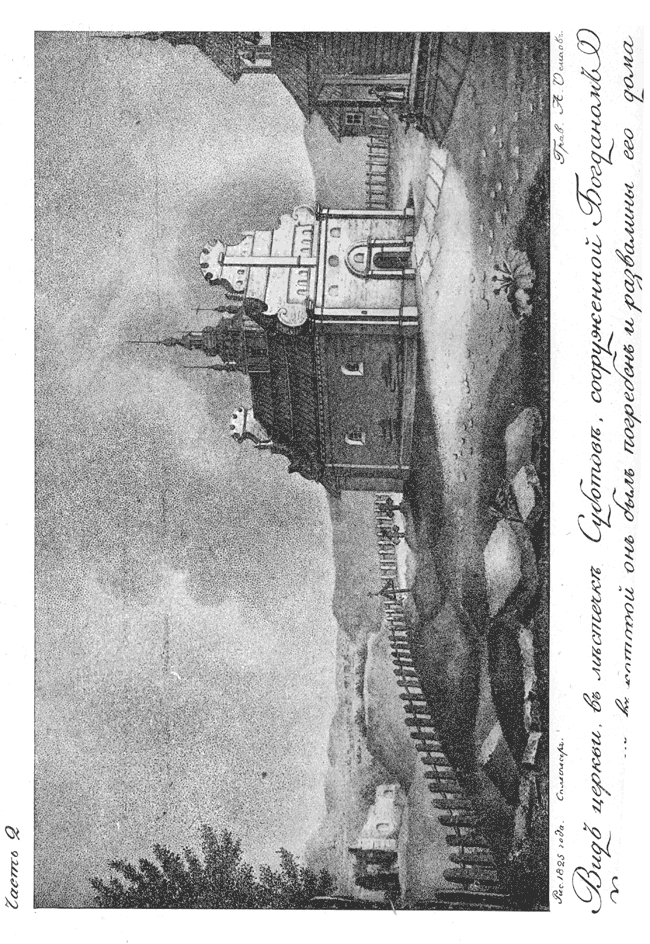 Вид церкви в местечке Суботов, сооруженной Богданом Хмельницким, в которой он был погребен и развалины его дома.