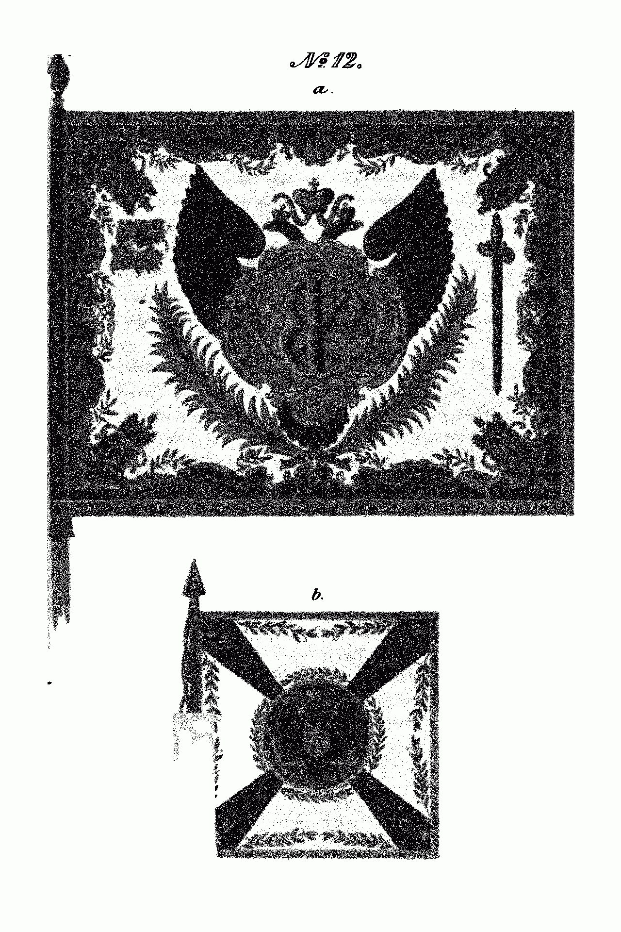 Знамя (а), пожалованное полку при коронации Императрицы Елизаветы Петровны и знамя (б), пожалованное при вступлении на престол Екатерины II.