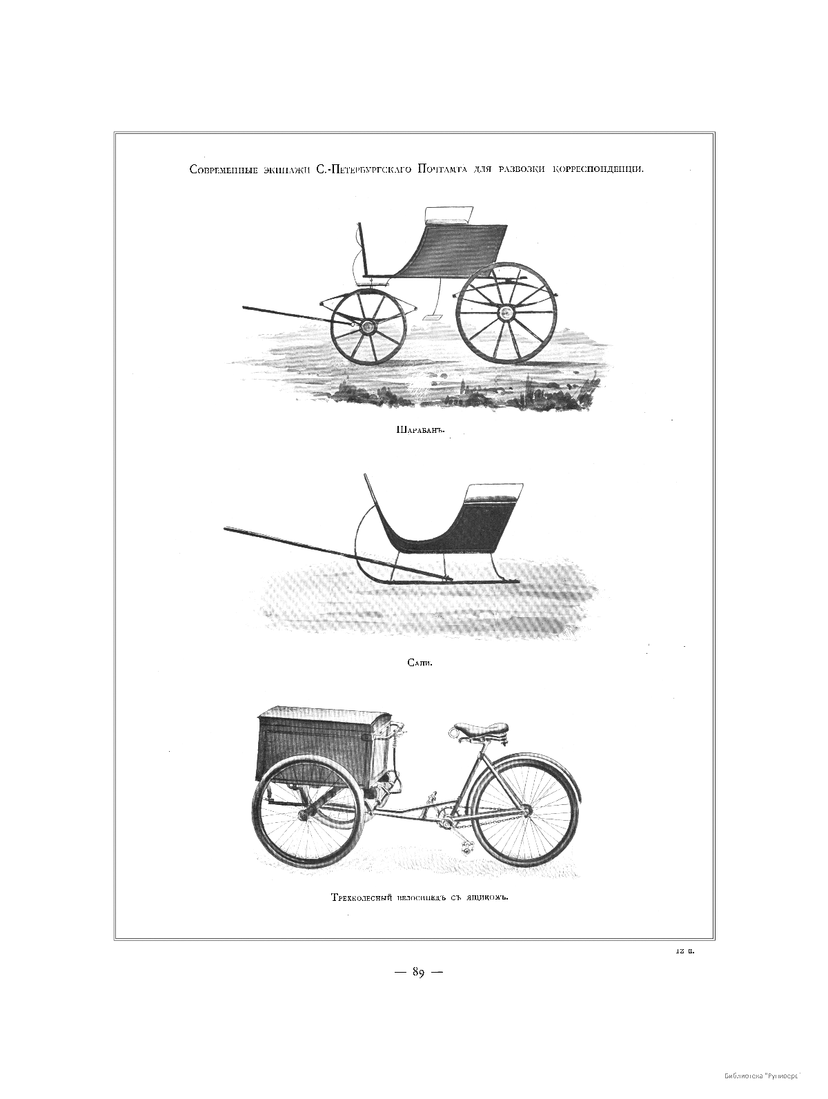 Современные экипажи С.-Петербургского Почтампта для развозки корреспонденции. Шарабан. Сани. Трехколесный велосипед с ящиком.