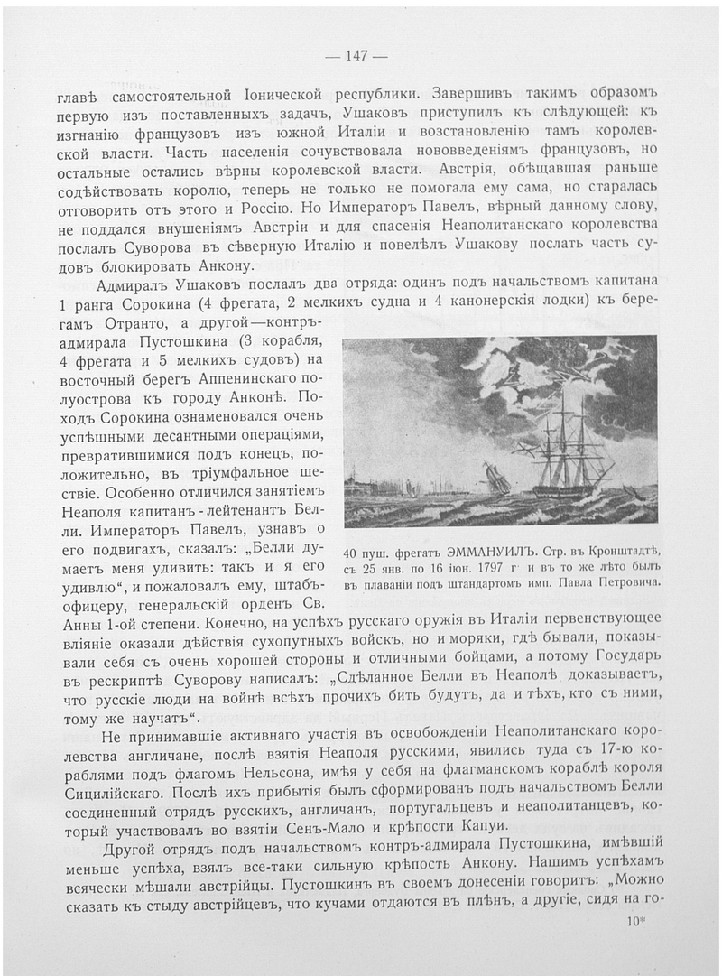 40 пуш.фрегат ЭММАНУИЛ. Стр.в Кронштадте, с 25 янв.по 16 июня 1797г и в то же лето был в плавании под штандартом имп. Павла Петровича.
