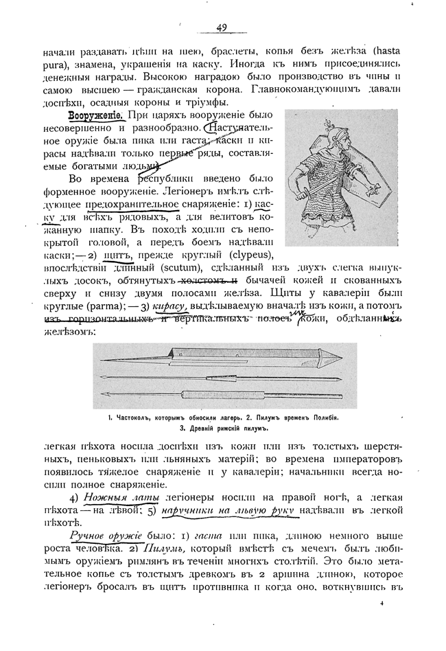 1. Частокол, которым обносили лагерь. 2. Пилум времен Полибия. 3. Древний римский пилум.