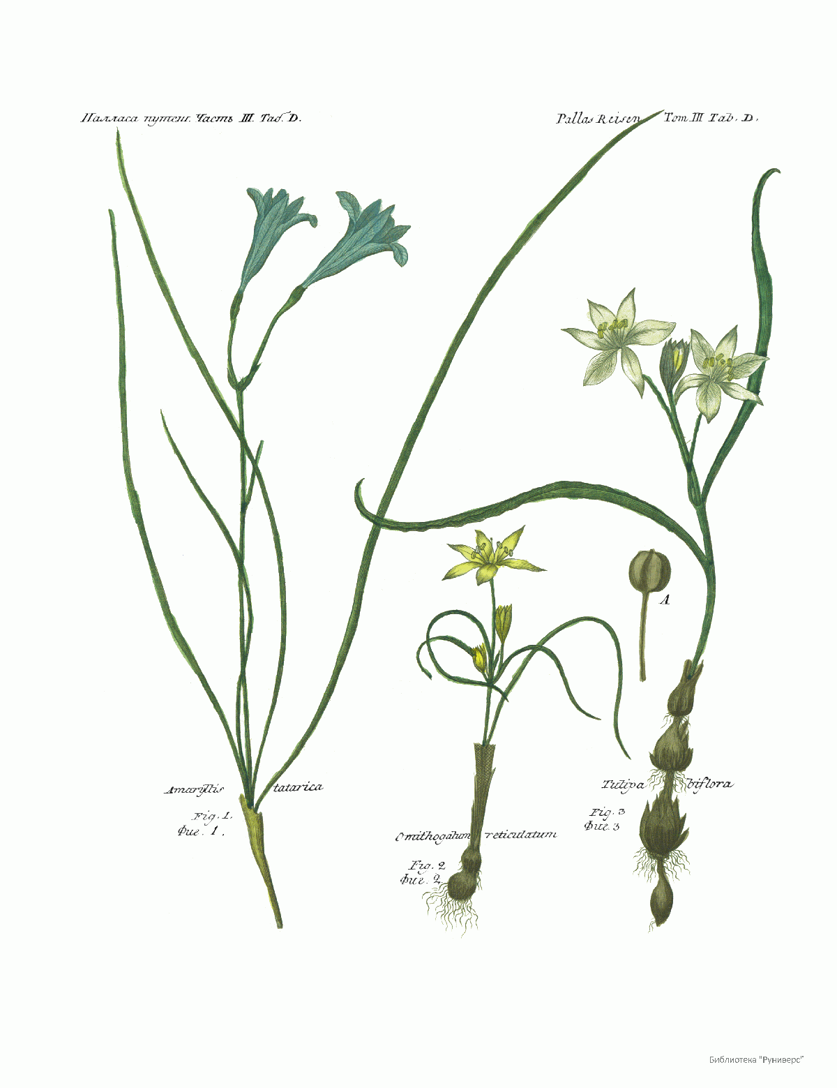 Том III. Таб.D. Amarillis tatarica. Omithogatum reticulatum. Tulipa biflora.