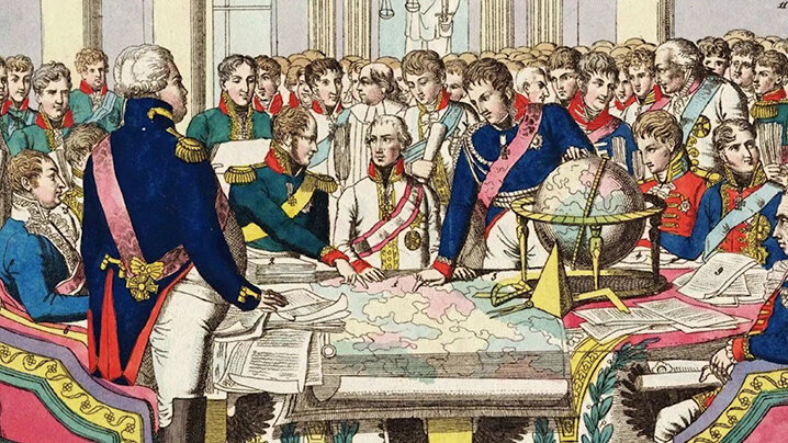 Участники Венского конгресса 1815 г. Раскрашенная гравюра. “Europas Wiedergeburt durch den großen Herrscherverein zu Wien 1814”.