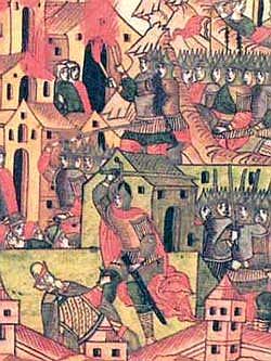 Взятие татарами русского города. Миниатюра из Лицевого летописного свода. XVI в.