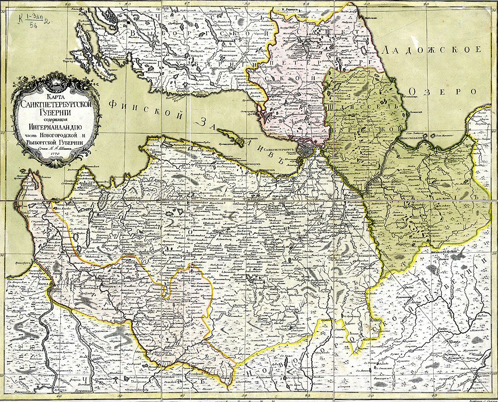 «Карта Санкт-петербургской Губернии содержащая Ингерманландию, часть Новгородской и Выборгской Губернии». Я.Ф.Шмит, С. Склунов. 1770 год
