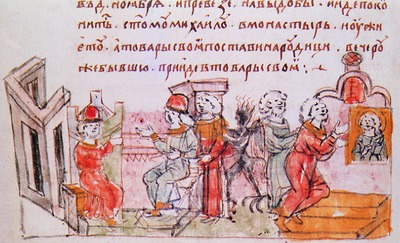 Беседа Давыда Игоревича Волынского и Святополка Изяславича Киевского о «коварстве» Василька Теребовльского. Миниатюра из Радзивиловской летописи. XV век