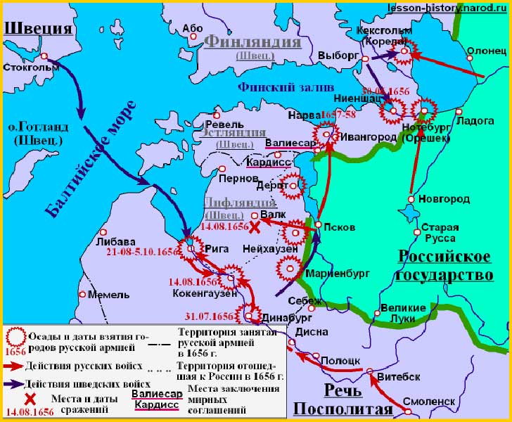 Карта боевых действий русско-шведской войны 1656-1658 гг.По условиям договора Россия возвращала Швеции все завоёванные и отошедшие к ней по Валиесарскому мирному договору 1658 года эстляндские и лифляндские города: Кокенгаузен, Дерпт, Мариенбург, Анзль, Нейгаузен, Сыренск. Таким образом была восстановлена граница, установленная Столбовским миром 1617 года. Русские получили право держать торговые дворы в Стокгольме, Риге, Ревеле и Нарве, шведы — в Москве, Новгороде, Пскове и Переяславле.