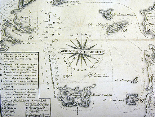На рассвете русскими кораблями была обнаружена у острова Лемнос турецкая эскадра, состоявшая из 10 линейных кораблей, 5 фрегатов, 3 шлюпов и 2 бригов (общее число пушек 1196)
