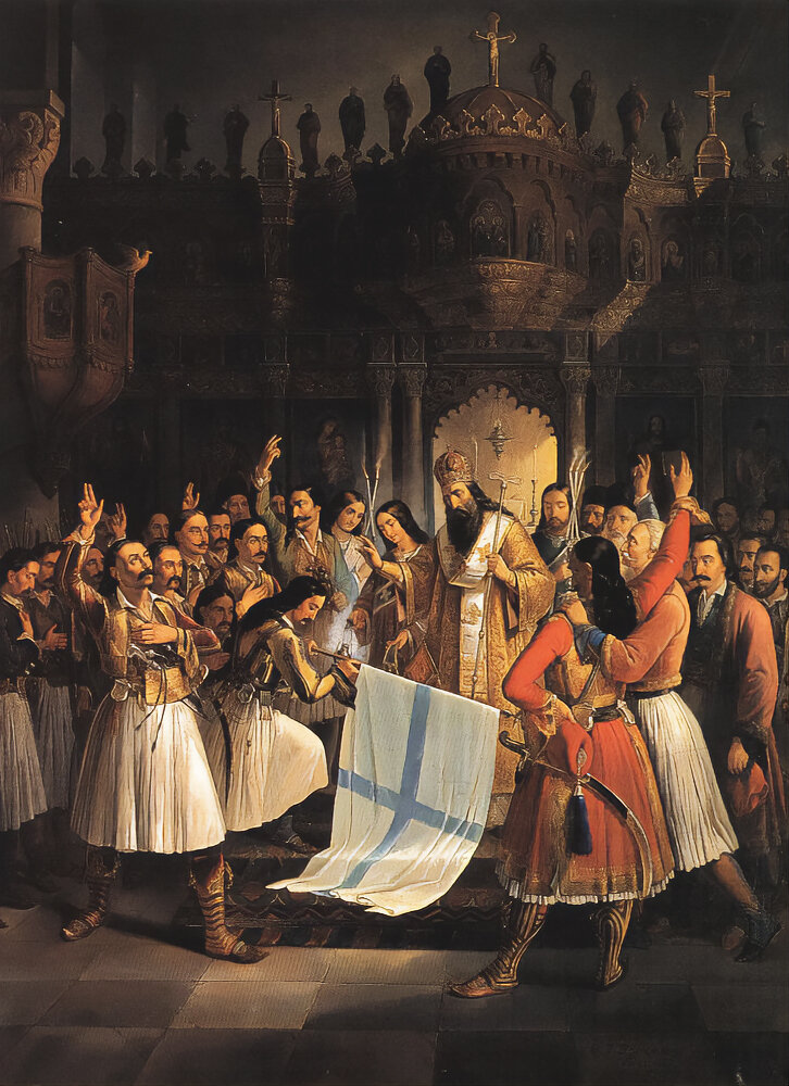 Епископ Герман благословляет знамя восставших в монастыре Агиа Лавра