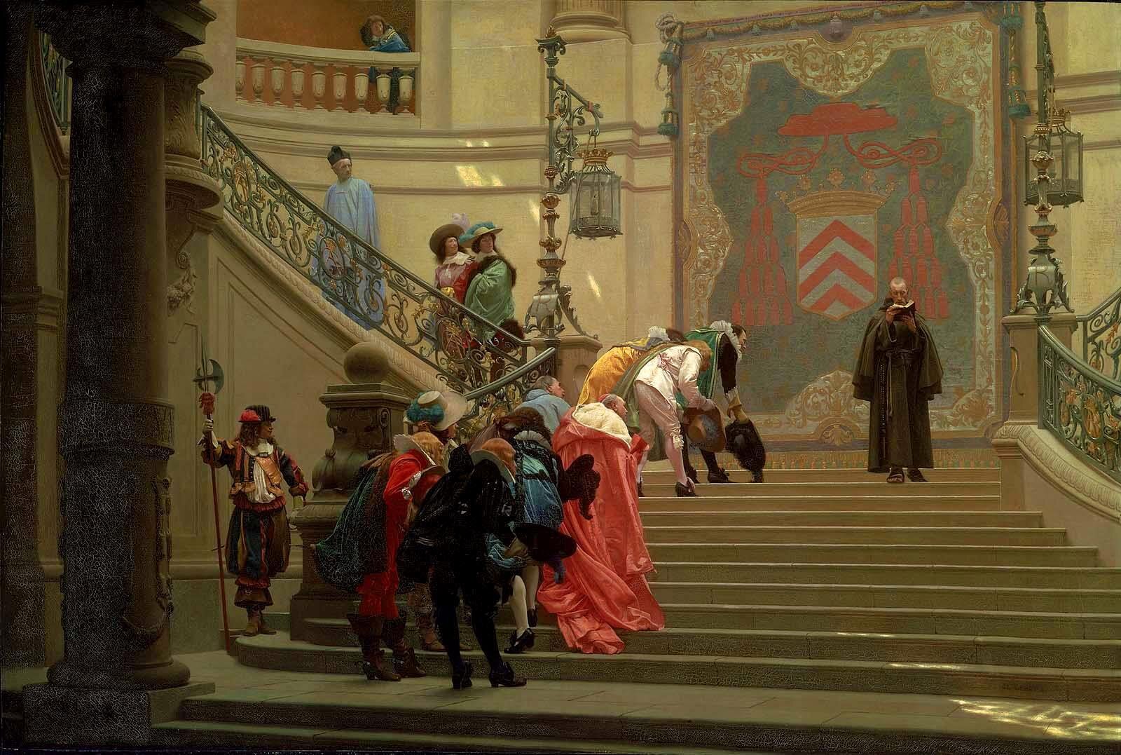 Каждое утро, что зимой, что летом, он вставал в четыре часа. Первый час дня посвящался созерцательной молитве перед распятием. Встав с колен, отец Жозеф звал своего секретаря, отца Анжелюса де Мортаня, и они вместе читали часы. В шесть начинался рабочий день. Отец Анжелюс зачитывал — в случае надобности дешифруя — свежие депеши от французских посланников и от менее явных заграничных агентов отца Жозефа, от его пятых колонн. По прочтении депеш отец Жозеф диктовал ответы. Это занимало три часа. В девять двери апартаментов распахивались — монах давал аудиенцию высокопоставленным чиновникам и посланникам зарубежных держав. В особо сложных и деликатных случаях он шел с посетителем к кардиналу, в чьи апартаменты вела тайная лестница. В полдень или чуть позже прием завершался, и отец Жозеф удалялся в одну из часовен того дворца, в котором в данное время проживал, чтобы отслужить мессу (кардинал отстаивал мессу в те же часы, но — примечательным образом — в другой часовне). Вернувшись с мессы, отец Жозеф заставал у себя в прихожей толпу посетителей всех родов и состояний — придворного, выпрашивающего очередную милость, монаха с отчетом о миссионерских трудах среди гугенотов, опального чиновника, обезумевшую от горя жену бастильского узника.