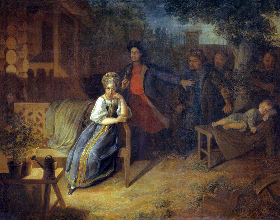 Картина написана на сюжет драмы Александра Александровича Шаховского (1777—1846) «Двумужница, или За чем пойдешь, то и найдешь» (1830)