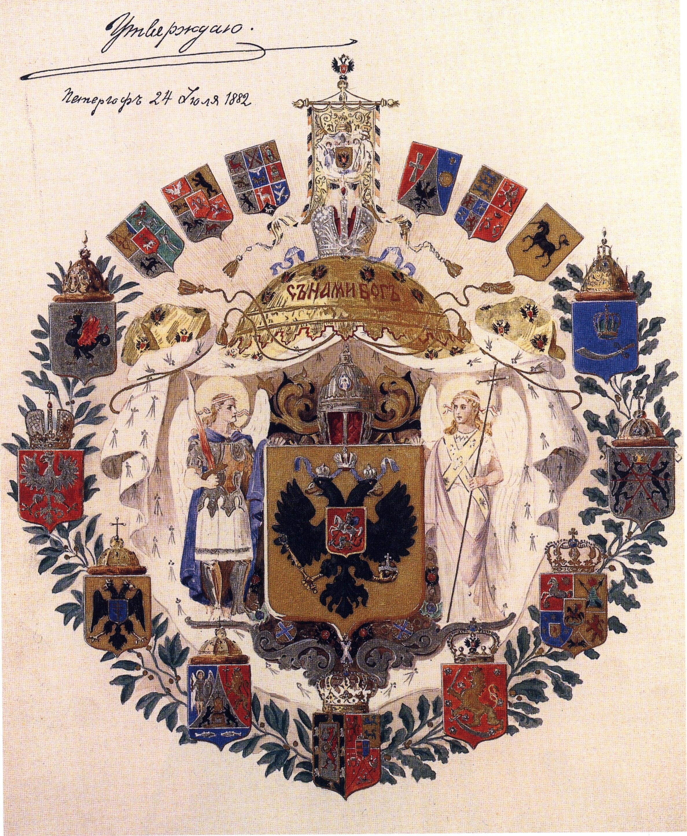 Главный щит снизу окружают девять щитов, увенчанных принадлежащими им коронами; гербы царств: I. Казанского. II. Астраханского. III. Польского. IV. Сибирского. V. Херсониса Таврического. VI. Грузинского. VII. Соединенные гербы великих княжеств: Киевского, Владимирского и Новгородского. VIII. Герб великого княжества Финляндского. IX. Родовой Его Императорского Величества герб.