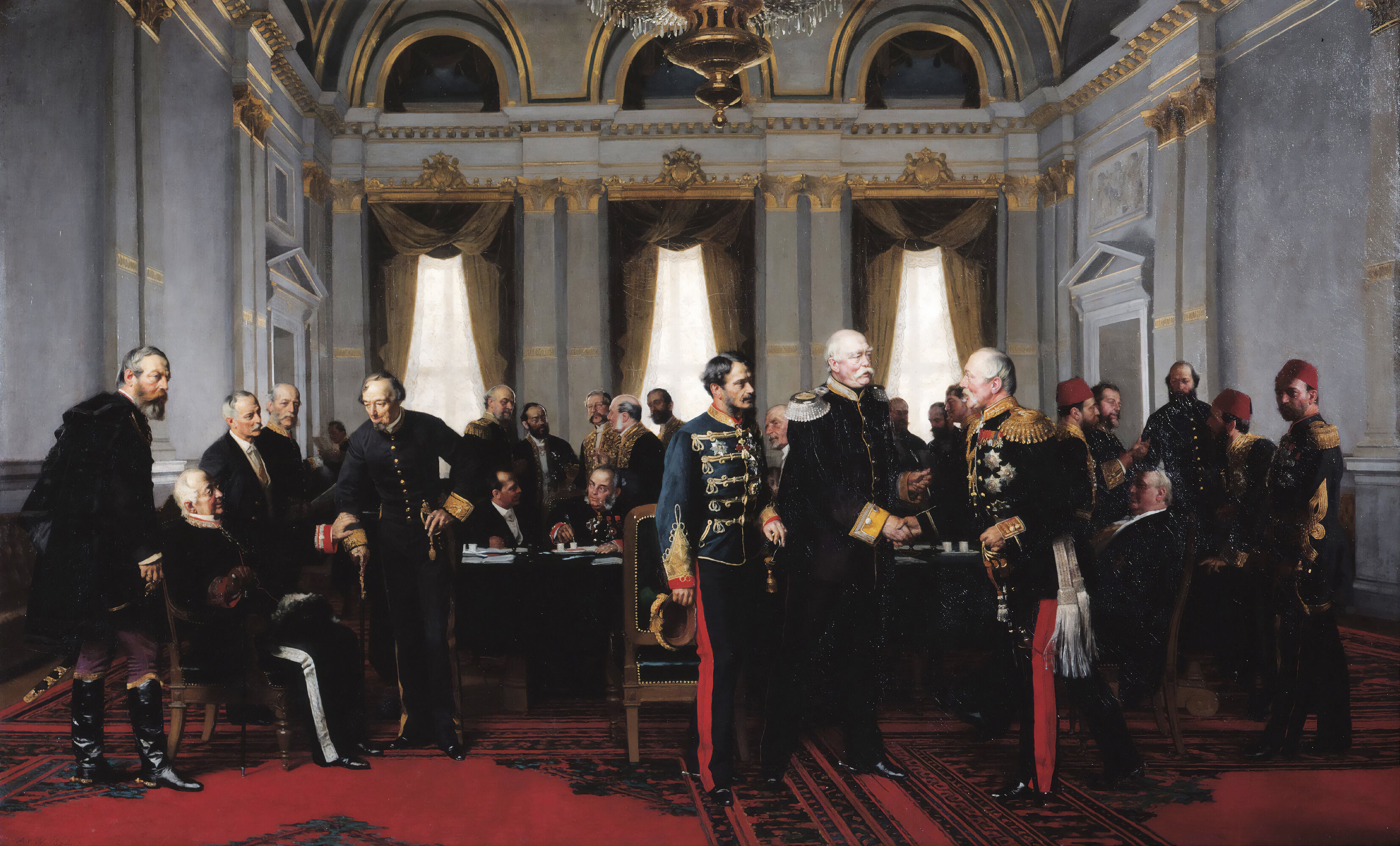 Слева в кресле сидит Александр Михайлович Горчаков (1798 — 1883), глава русского внешнеполитического ведомства, канцлер Российской империи. Горчаков придерживает за локоть британского премьер-министра Бенджамина Дизраэли (1804 — 1881), который накануне конгресса заключил ряд сепаратных соглашений, невыгодных для России. В центре обмениваются рукопожатием Отто фон Бисмарк (1815 — 1898), рейхсканцлер Германской империи, и представитель России на Берлинском конгрессе генерал от кавалерии Пётр Андреевич Шувалов (1827 — 1889).