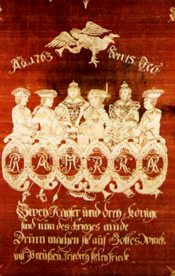 Аллегорическое изображение Губертусбургского мира, слева направо: Швеция, Франция, Россия, Саксония, Австрия, Пруссия
