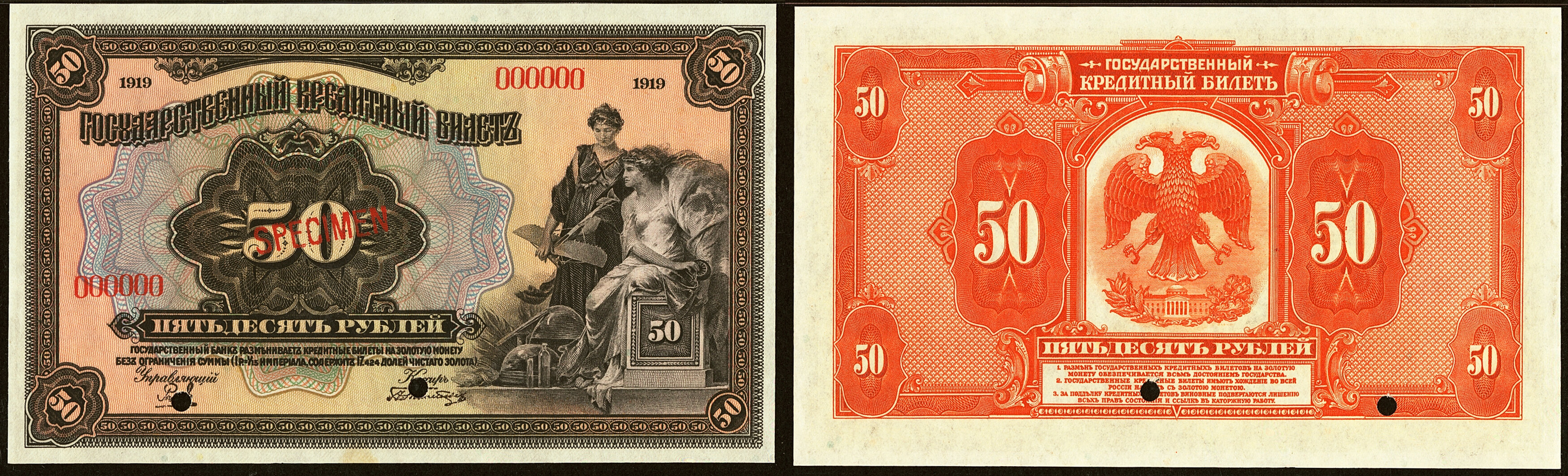 Краткосрочное обязательство Государственного Казначейства Российского правительства адмирала А.В. Колчака 50 руб. Срок 1 марта 1920 г. Аверс