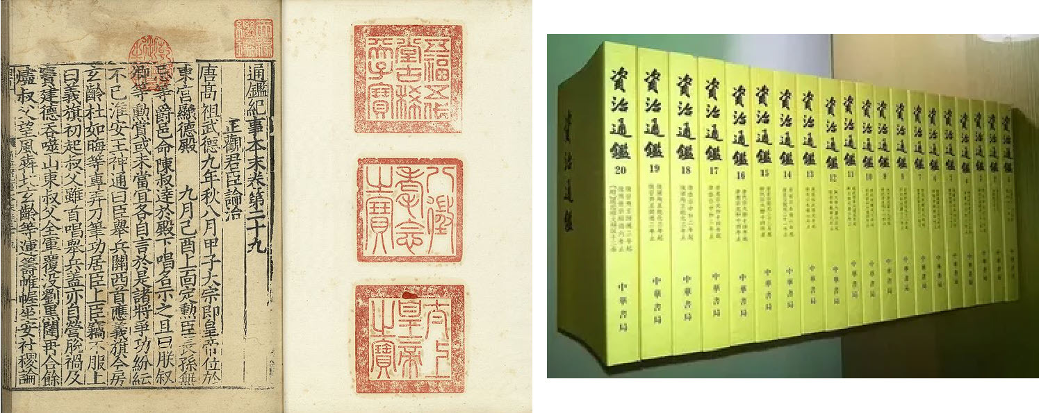 Оригинальная страница Zīzhì Tōngjiàn с императорскими печатями и современное издание в 20 томах.
