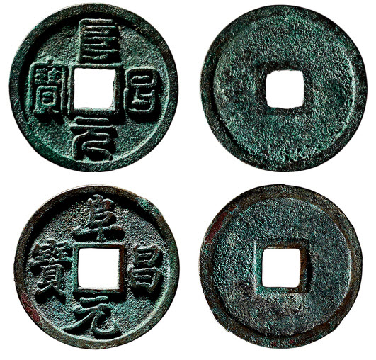 Fù chāng yuán bǎo (阜昌元寶), 1 вэнь, сверху почерк чжуаньшу ($5890) снизу кайшу ($7365), обе проданы на China Guardian Spring Auction 2018.
