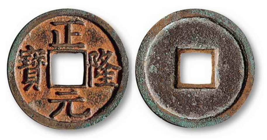 Редкая разновидность zhèng lóng yuán bǎo (正隆元寶) – единственной монеты Дигуная, редкость заключается в необычном написании иероглифа 正, 4 гр, 25 мм. Продана в 2010 г. на аукционе China Guardian за $2770. Как видите, редкость этих монет и близко не стоит с монетами Си-цзуна.