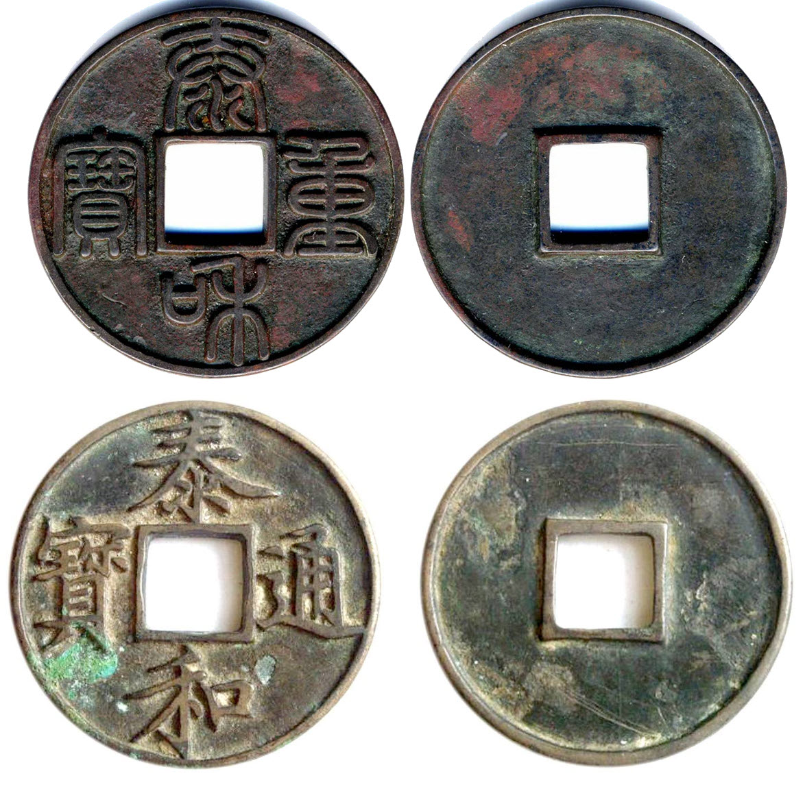 Удивительной красоты tài hé zhòng bǎo (泰和重宝) 10 вэнь, Чжан-цзуна, верхняя 20.58 гр., 44.5 мм почерк чжуаньшу, $18-20 тыс.; снизу 10 гр, 42 мм tài hé tōng bǎo (泰和通宝) почерк кайшу, чрезвычайно редкая, $60-90 тыс. Кроме этих гигантов существовали монеты в 1, 2, 3 вэнь тоже с девизом tài hé tōng bǎo. Меньшие монеты стоят порядка $0.5-1 тыс