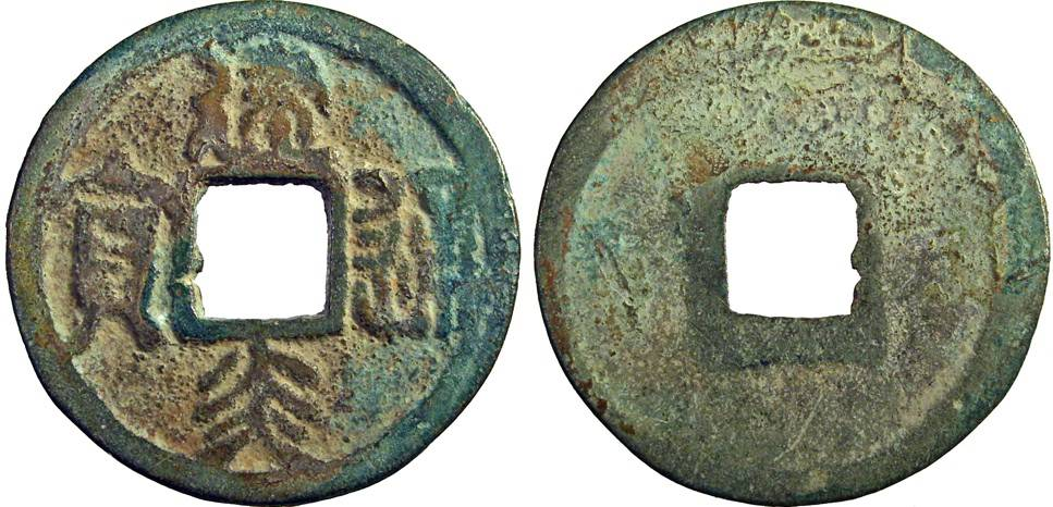 На первый взгляд - ничего необычного, но цепкий взор знатока немедленно опознает не настоящий почерк кайшу, а его варварскую имитацию, да еще и не полную: иероглиф 通 написан почерком чжуаньшу, а сложный иероглиф 寶 упрощен до связки 宀 и 貝. Возможно частный выпуск, или, что вероятнее, вьетнамская подделка. Вес 3,65 гр, диаметр 26,4 см. Отметим, что аутентичные подделки (то есть тех же времен, что и оригиналы) обладают не меньшей исторической ценностью, раскрывая детали экономики тех лет. Три аналогичные монеты, найденные в провинции Чжэцзян, тем не менее, были признаны южносунскими в одном из самых авторитетных источников по нумизматике Китая, уже упомянутом 中國錢幣大辭典