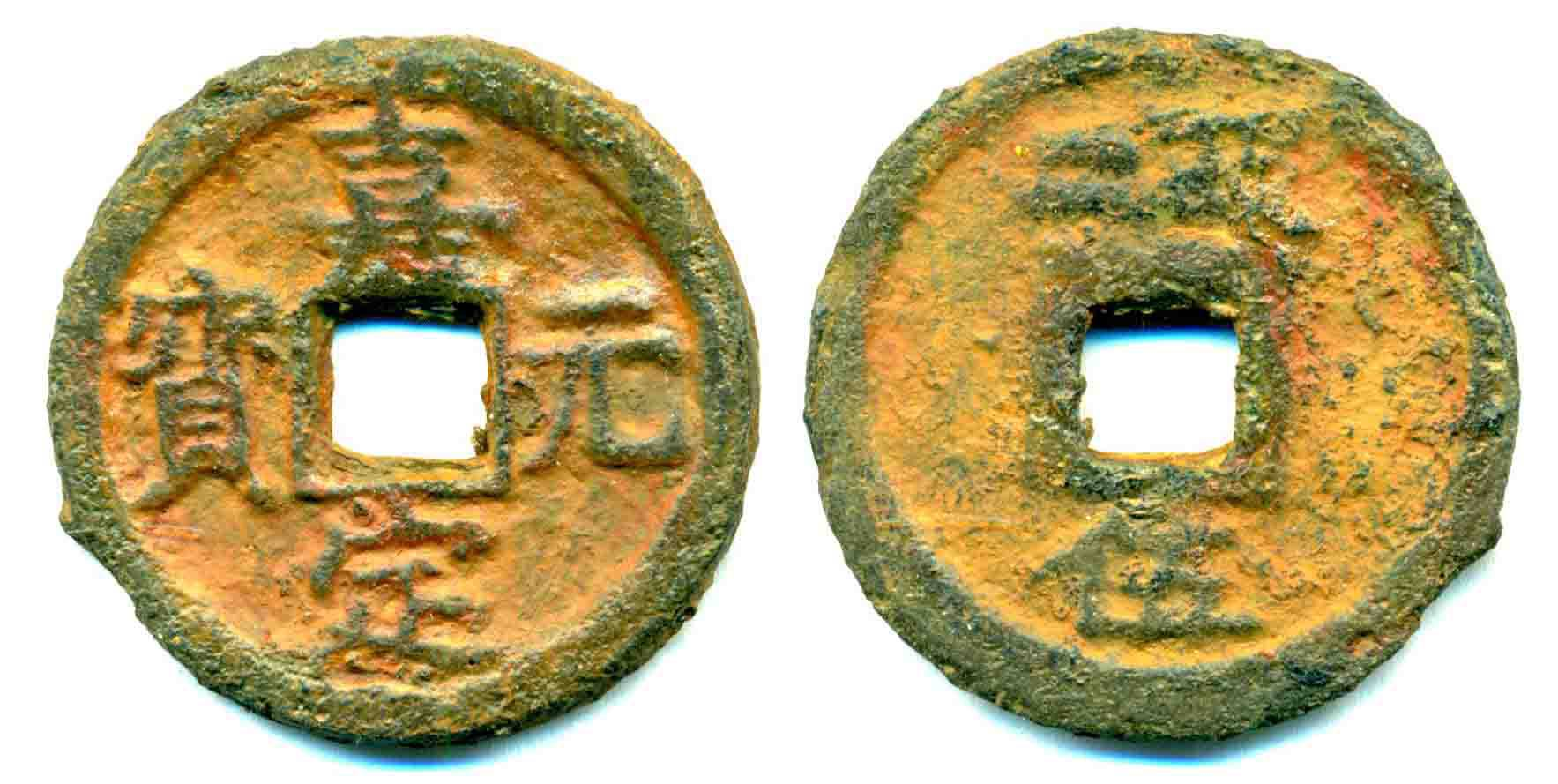 Нин-цзун сменил за свое правление 5 девизов, причем под последним он отлил аж 21 основную разновидность монет, причем в нескольких почерках, из бронзы и чугуна и на куче дворов. В итоге только этого императора можно собирать полжизни. На фото чугунная Jiādìng yuánbǎo (嘉 定 元 寶), 34,6 мм, 11,7 гр., 5 вэнь. Стоимость, в зависимости от сохранности, от 30 до 100 долларов.