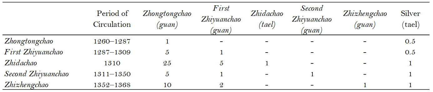 Сравнительный курс юаньских банкнот из работы The Rise and Fall of Paper Money in Yuan China 1260-1368