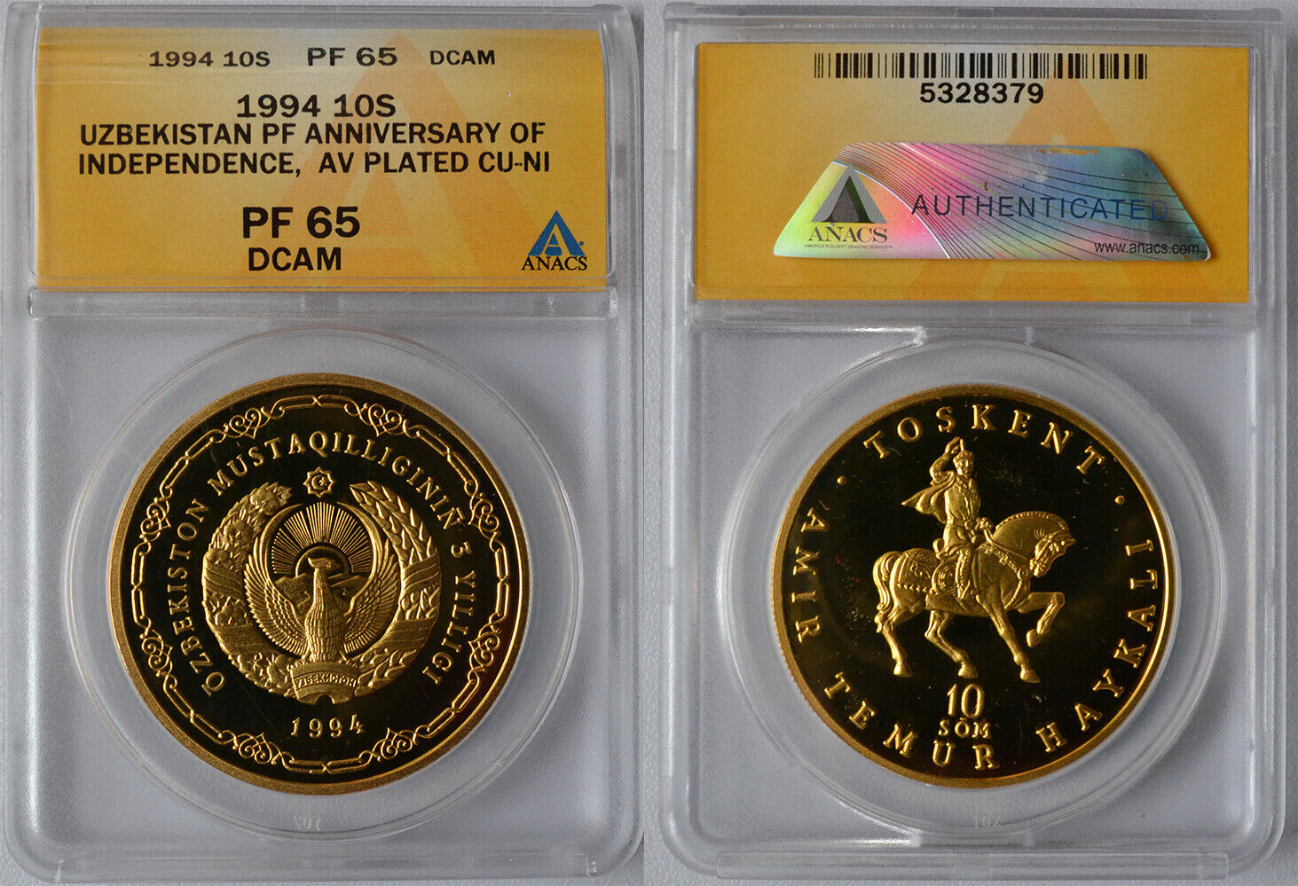 Естественно, Узбекистан не мог удержаться. Конкретно это - редкая пробная монета в честь 3-х лет независимости с Эмиром Тимуром во всей славе, не хватает только обожаемого им кургана из голов пленных. Материал - крайне экзотический позолоченный медно-никелевый сплав. В силу раритетности стоит $675.