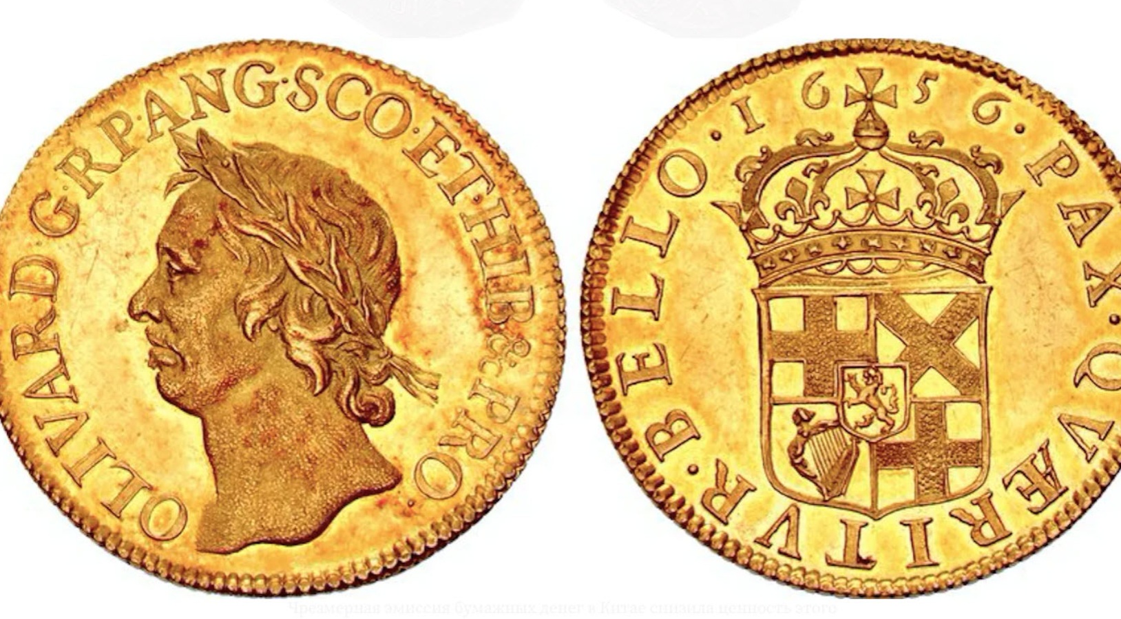 Сам Кромвелль тоже оставил после себя несколько нумизматических раритетов. Самый ценный из них — образец золотой монеты в 50 шиллингов 1656 г. работы медальера Томаса Саймона (Thomas Simon). Кромвелль введ новую стандартную монету — броуд (broad), номиналом в 20 шиллингов (9 гр. золота, 30 мм), но чеканилась она всего один год и сейчас стоит в районе 6–8 тыс. долларов. Тогда же было изготовлено ограниченное число донативных монет в 2,5 броуда из которых сохранилось по разным оценкам от 11 до 20 экземпляров. В настоящее время они представляют собой одни из самых больших раритетов среди английских монет. Та что на фото была продана в 2004 г. за 64 тыс. долларов и перепродана за колоссальные 667 тыс. долларов в 2021 г.