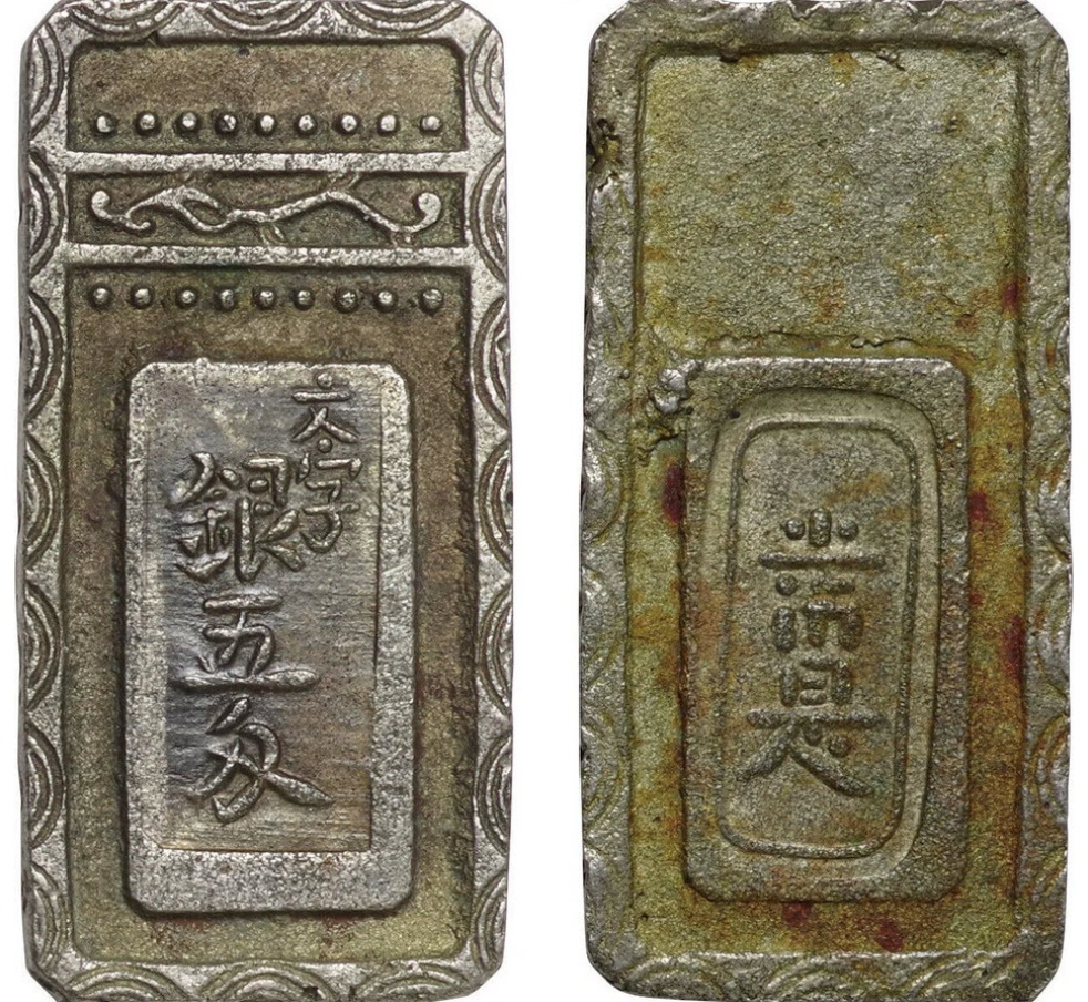 1765 г., стандартный монетообразный японский серебряный слиток 五匁銀 весом 5 цяней (18.75 гр.), продан за $1242