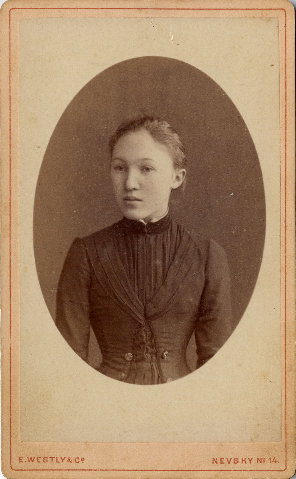 Фотограф Э. Вестлинк, С. Петербург. Портрет молодой девушки. На обороте надпись: “ Моей дорогой Саше на память от горячо любящей ее Мани. 19 апр. 1888года”.