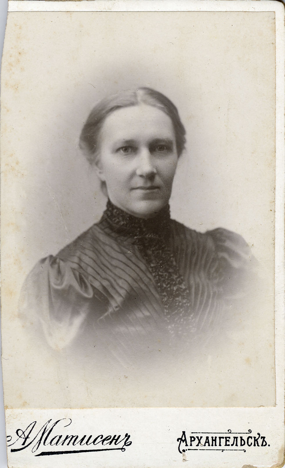 Фотограф А. Матисен, Архангельск. Портрет женщины средних лет. На обороте надпись: “Александре Ивановне Калиновской для большей памяти. Е. Котова. Декабрь 1905 года”.