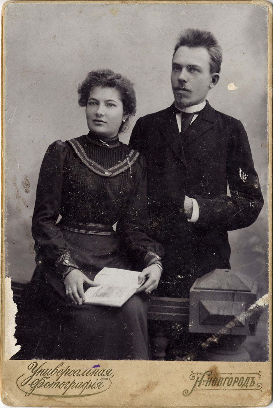 Портрет молодоженов Мордвиновых. На обороте надпись: “На добрую память дорогой сестре Анюте от Брата Коли Мордвинова, а также на добрую память от жены его - Любочки. (24 октября 1902 года. День свадьбы)”.