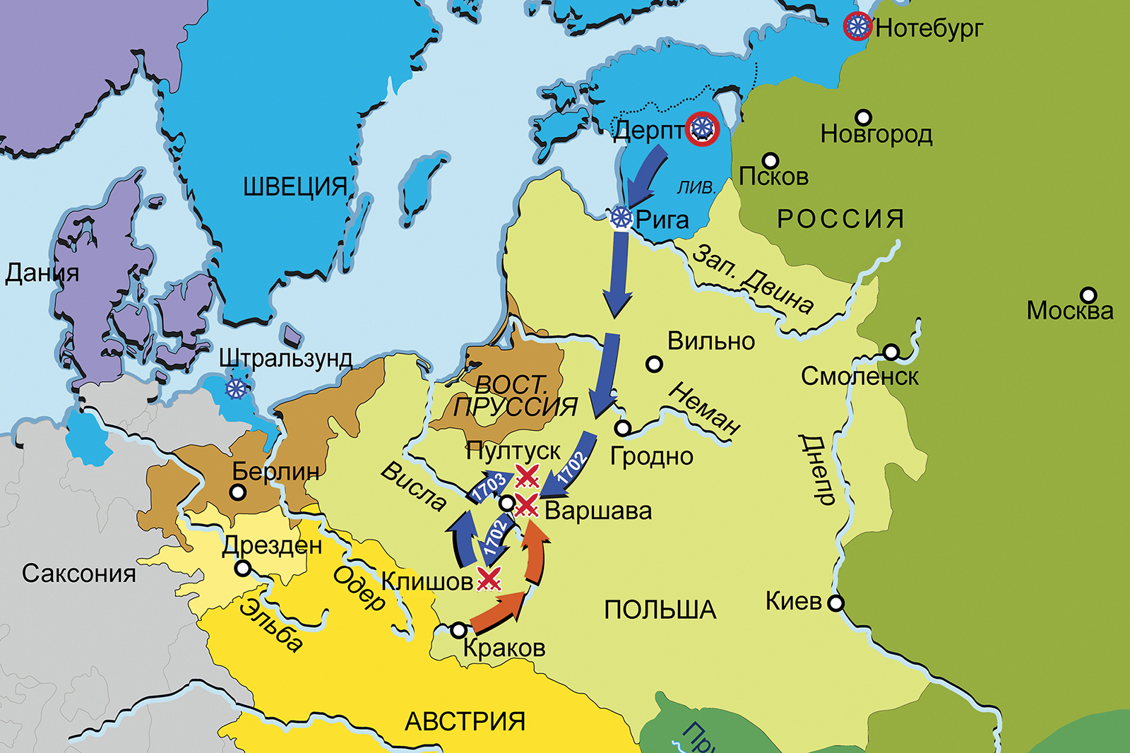 Карта кампаний 1701–1704 гг. Действия в Лифляндии и Польше (Великая Северная война 1700–1721 гг.)