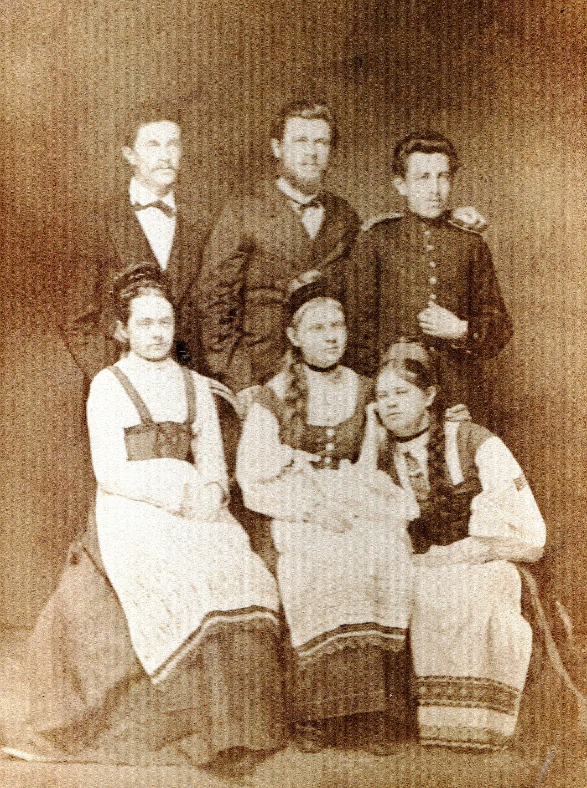 Неизвестный фотограф. Групповой портрет молодых людей. Девушки в русских костюмах. 1903-1906. Частное собрание (архив Мяздриковых).