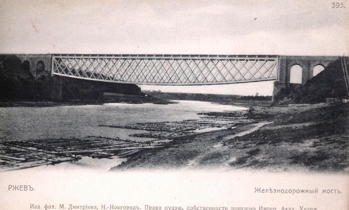 Железнодорожный мост через реку Волгу в городе Ржеве. Общий вид.