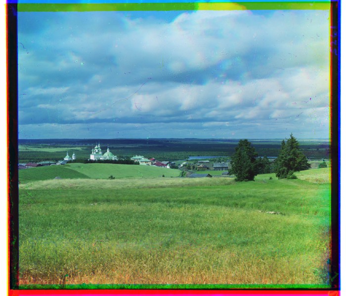 Кирилловский уезд. Горицкий монастырь. [[1909]. Вид с монастыря Мауровой горы. За монастырем видна река Шексна. (Ныне - Вологодская область.)
