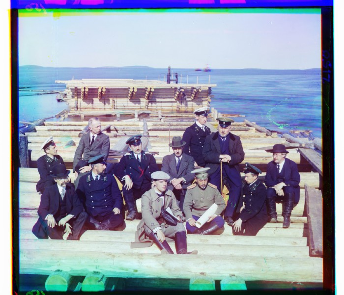 Постройка дамбы для ж. дороги в Сорочей Губе. Группа участников ж.д. постройки. Кемский уезд Архангельской губернии.