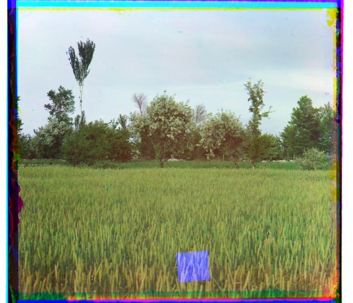 Засеянное поле с цветущими деревьями на заднем плане. Парный снимок к № 0083. Местоположение неизвестно