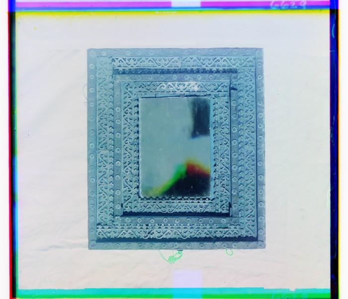 Древнее зеркало XVII века, украшенное резным из железа орнаментом на цветной слюде.