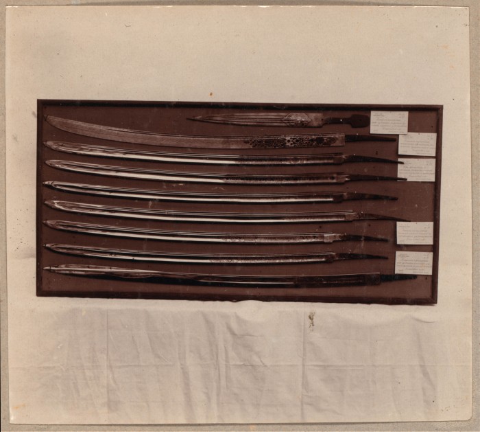 Уфимская губерния, г. Златоуст (уездн.), Златоустовский завод. Последовательный ход выделки клинков, ножен и изготовление сварочного булата. Образцы солдатских шашек.