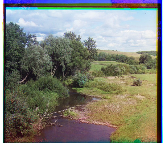 1911. Река Колочь с моста при въезде в с. Бородино, куда спадает пологость редута Раевского.