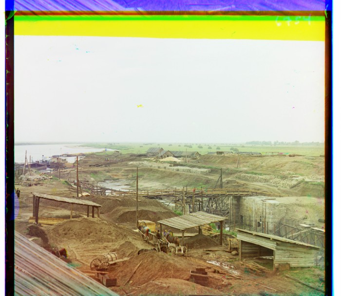 1912. Село Белоомут на реке Оке. Работы по постройке шлюза на Оке.